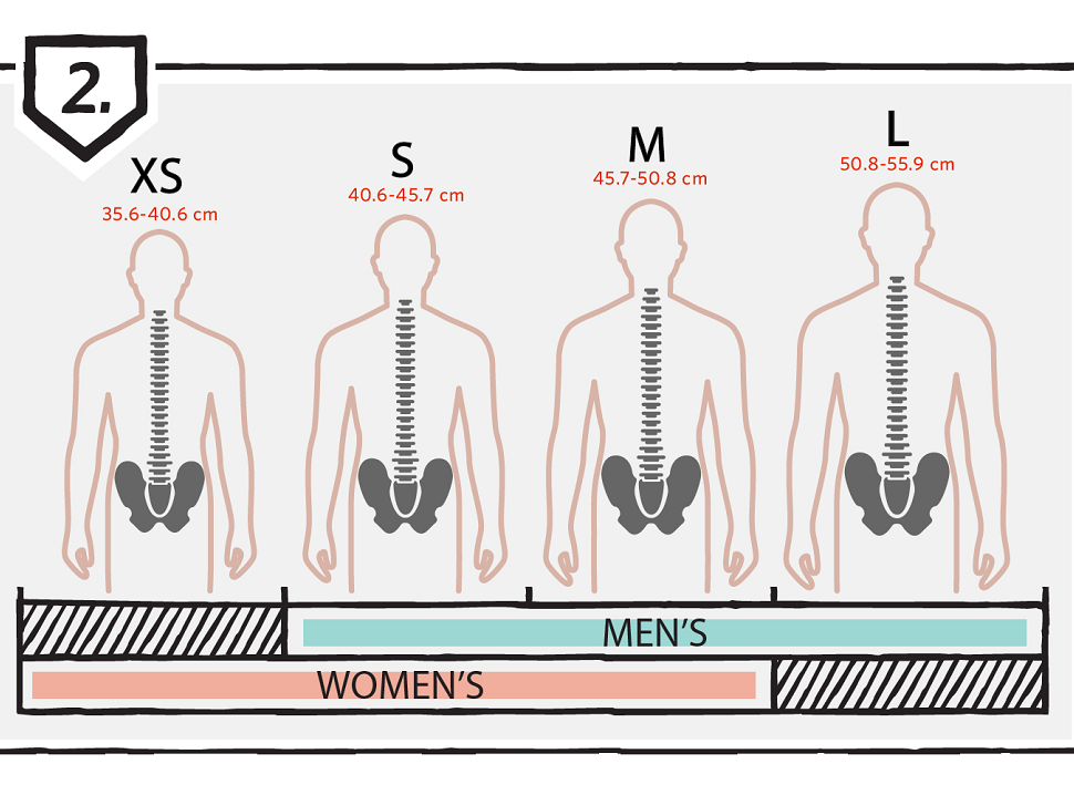 Наклонете главата си напред, за да улесните измерването и намерете най-изпъкналата кост в основата на шията. Това е 2ят вратен прешлен – началната точка за вашата измервателна линия. Отново наклонете главата си нагоре и измерете надолу по гръбначния стълб, докато стигнете до тазовите си кости. Това е точката в центъра на гръбначния ви стълб, която се изравнява с най-високата точка на бедрената ви кост.