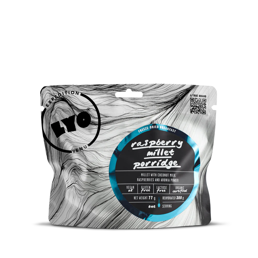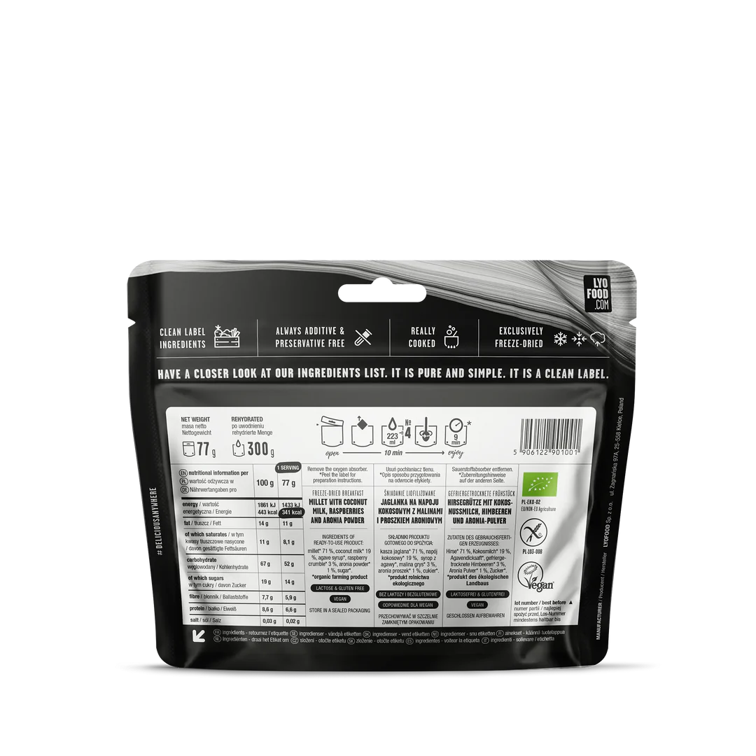 Пухкава и кремообразна каша от био просо и кокосово мляко, овкусена с агаве сироп, малини и поръсена с арония на прах. Тази лека, но засищаща закуска е идеална за енергичен старт на деня сред природата. Подходяща за вегани, без лактоза и глутен, и приготвена изцяло от съставки от биологично земеделие.